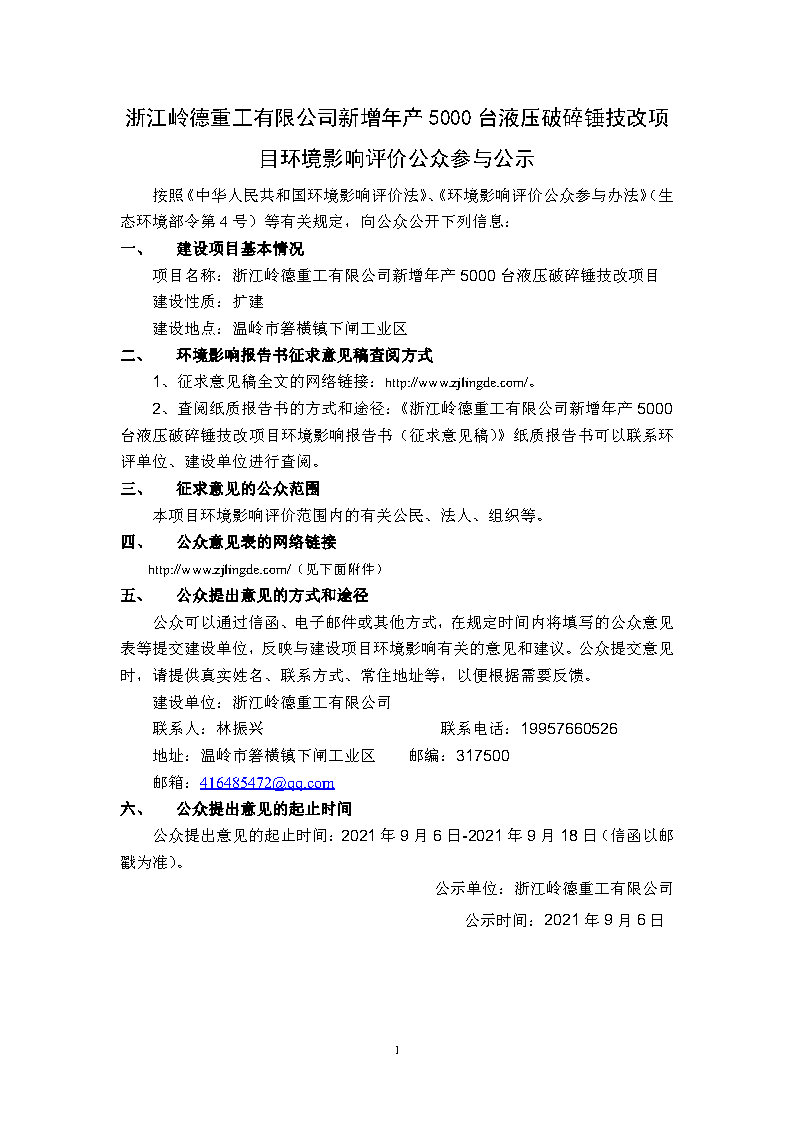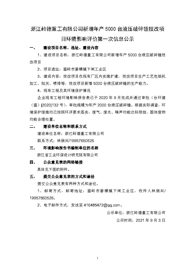 浙江嶺德重工有限公司新增年產(chǎn)5000臺液壓破碎錘技改項目環(huán)境影響評價第一次信息公示