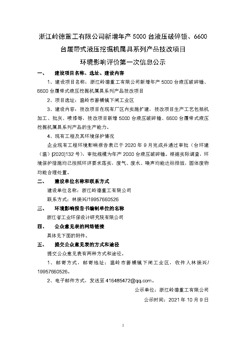浙江嶺德重工有限公司新增年產(chǎn)5000臺液壓破碎錘、6600臺履帶式液壓挖掘機屬具系列產(chǎn)品技改項目環(huán)境影響評價第一次信息公示