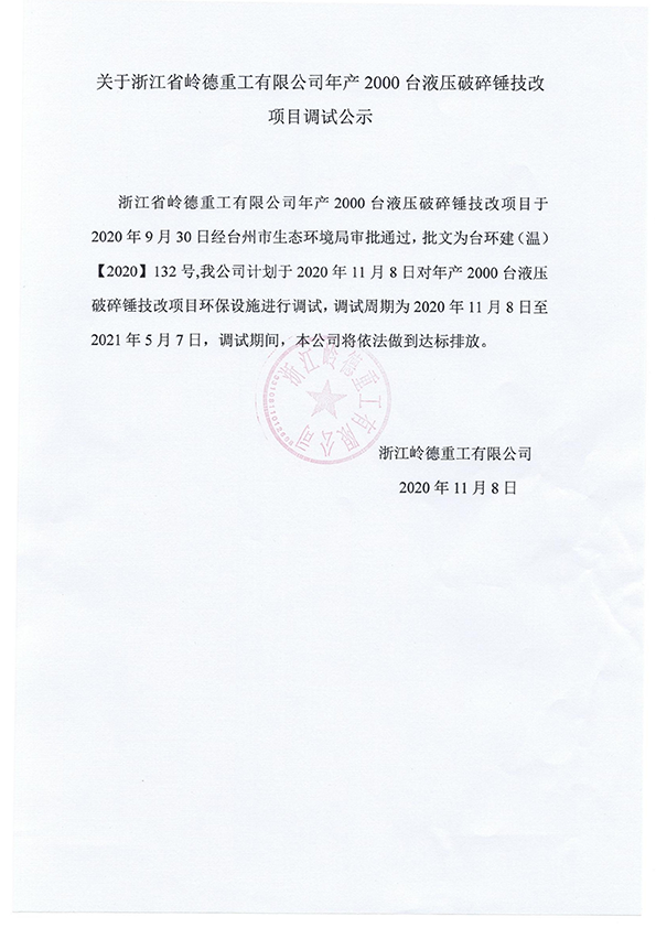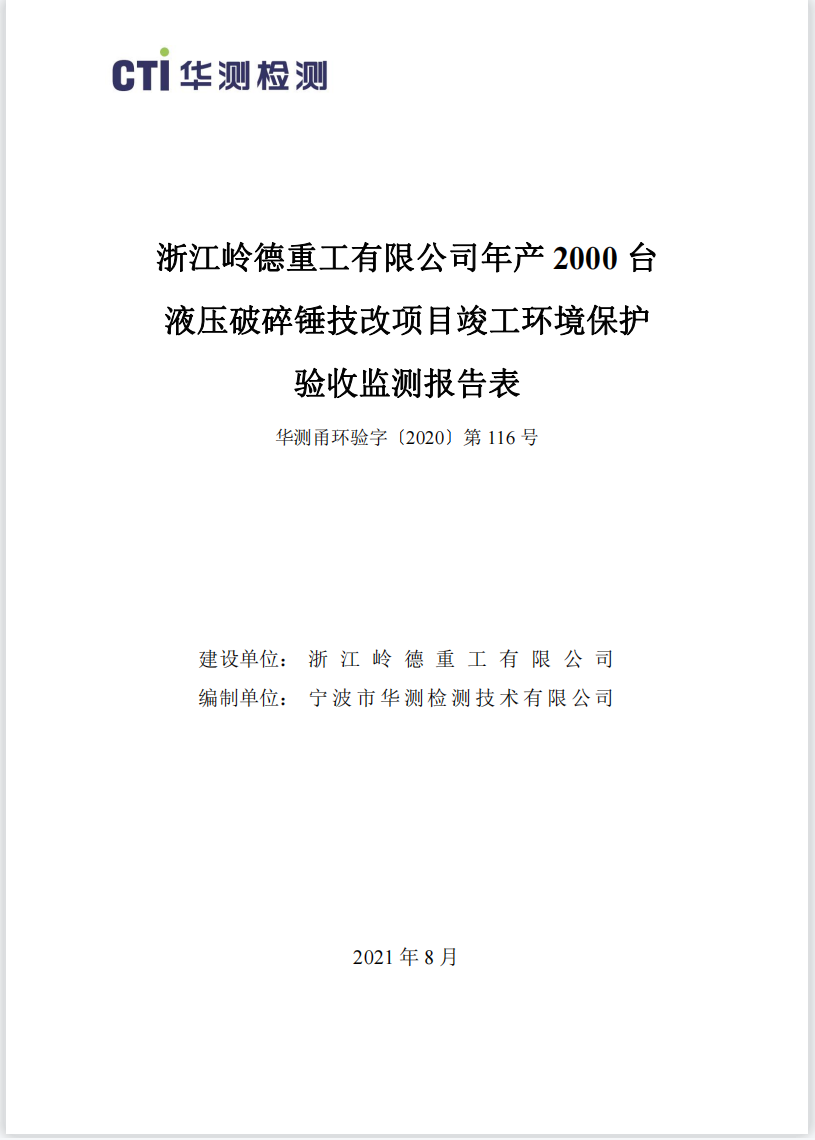 浙江嶺德重工有限公司年產 2000臺液壓破碎錘項目竣工環(huán)境保護驗收公示